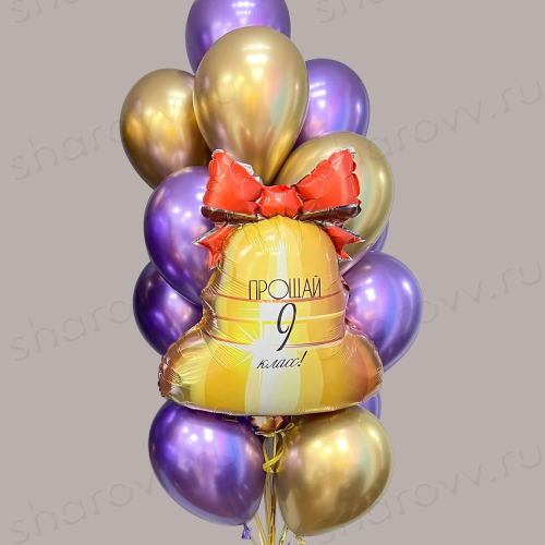 Фонтан из шаров "Последний звонок" состоит из 13 латексных шаров хром (7 фиолетовых и 6 золотых) и 1 фольгированного шара в виде колокольчика с индивидуальной надписью. Размер латексных шаров 35-40см. Гарантированное время полета  шариков 48 часов (как правило летают неделю и дольше). Шарики доставляются собранные в фонтан на грузе.