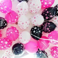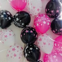 Воздушные шары с надписью "С днем рождения" и звездами наполнены гелием. Время полета 12 часов, можно продлить обработав шарики Hi-Float. Гарантированное время полета обработанных шариков 48 часов (как правило летают неделю и дольше).