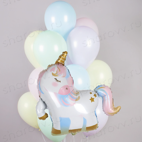 Облако шаров "Единорог Зефирка" состоит из 12 латексных шаров макарунс ассорти и фольгированной фигуры в виде единорога. Размер латексных шаров 35-40см. Гарантированное время полета шариков 48 часов (как правило летают неделю и дольше). Шарики доставляются собранными в букет который можно распустить.