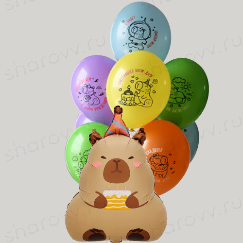 Сет из шаров "Капи День" состоит из букета шаров, в котором 9 шариков ассорти с рисунком и фольгированная фигура капибары с тортом на грузике. Размер латексных шаров 35-40см. Гарантированное время полета шариков 48 часов (как правило летают неделю и дольше). Шарики доставляются собранными сет из букета шаров ассорти на усмотрение аэродизайнера, который можно будет распустить под потолок и фольгированого шара в виде капибары на отдельном грузике. Если необходимо собрать букет в фонтан или добавить шарики, сообщите об этом в комментарии к заказу или по телефону менеджеру.
