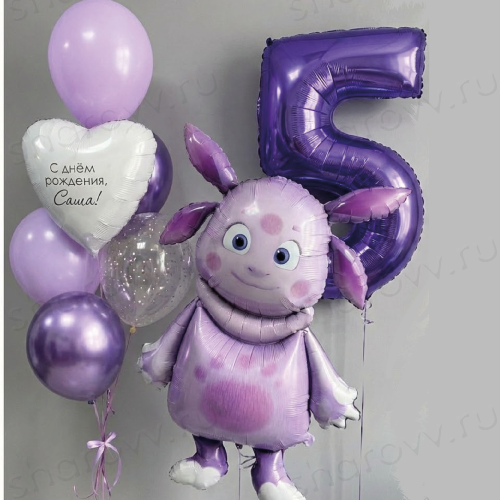 Сет из шаров "Поздравление Лунтика" состоит из фольгированной фигуры в виде любимого героя мультика, фольгированной цифры и фонтана шаров, в котором: