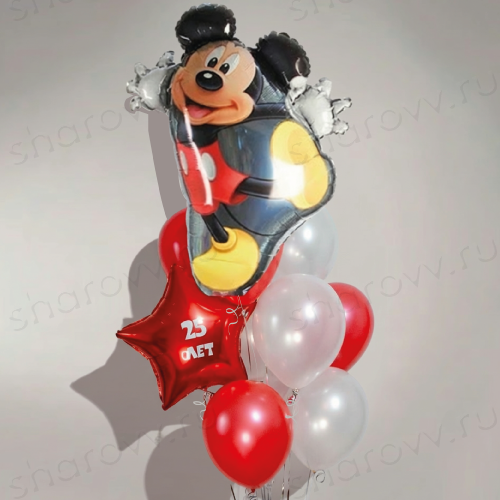 Фонтан из шаров "Микки" состоит из 11 латексных шаров металлик (5 красного и 6 белого цвета), красной фольгированной звезды с индивидуальной надписью и фольгированной фигуры Микки Мауса. Размер латексных шаров 35-40см. Гарантированное время полета шариков 48 часов (как правило летают неделю и дольше). Шарики доставляются собранными в фонтан на грузе. Чтобы изменить надпись на фольгированной звезде или убрать ее, внесите изменение в заказ в комментарии при оформлении или по телефону менеджеру при подтверждении заказа.