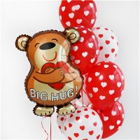 Воздушный шар из фольги "Мишка с сердцем в объятиях" надут гелием. Время полета фольгированного шара от 3-х дней до нескольких недель.
