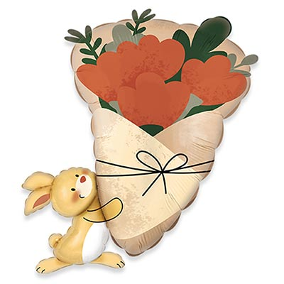 Воздушный шар из фольги "Зайка с букетом цветов" надут гелием. Время полета фольгированного шара от 3-х дней до нескольких недель.