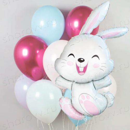 Сет из шаров "Ушастый милаш"  состоит из 8 латексных: 2 хром и 6-ти латексных шариков пастель(2 голубых, 2 розовых, белый и сереневый) и 1 фольгированного шара в виде веселого зайчика. Шарики доставляются собранные в букет на двух грузиках.