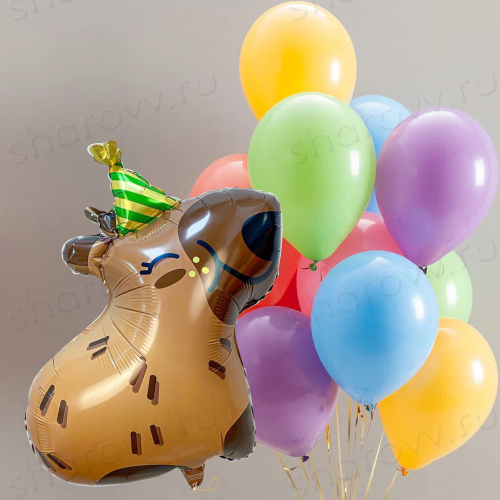 Сет из шаров "Капибара и букет ассорти" состоит из 11 латексных шаров ассорти макарунс и 1 фольгированной фигуры в виде капибары на грузике. Размер латексных шаров 35-40см, время полета 12 часов, можно продлить обработав шарики Hi-Float. Гарантированное время полета обработанных шариков 48 часов (как правило летают неделю и дольше). Шарики доставляются собранными в сет из фольгированного шара на грузике и букета шаров ассорти, который можно распустить. Если необходимо собрать букет в фонтан из шариков, сообщите об этом в комментарии при оформлении заказа или по телефону менеджеру.