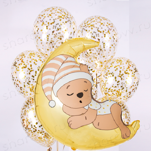 Сет из шаров "Колыбельная для мишутки" состоит из 9 латексных (с конфетти) шариков под потолоки 1 фольгированного шарика в виде медвежонка на месяце. Размер латексных шаров 35-40см. Гарантированное время полета шариков 48 часов (как правило летают неделю и дольше). Шарики доставляются собранные в букет шаров с конфетти. который можно распустить и фольгированного шара на грузике.
