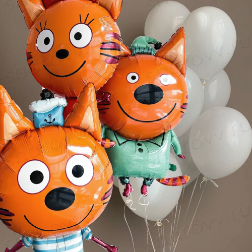 Сет из воздушных шаров "Три кота в облаках" наполнен гелием газообразным. В составе композиции три фольгированные фигуры известных персонажей (каждая на грузике) и фонтан из 10 белых шариков. Шары доставляем в надутом виде.
