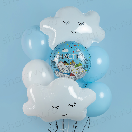 Фонтан из шаров "Облако счастья" состоит из 10 латексных шаров пастель голубого и белого цвета, двух фольгированных облаков и круглого фольгированного шара с готовым дизайном. Размер латексных шаров 35-40см. Гарантированное время полета шариков 48 часов (как правило летают неделю и дольше). Шарики доставляются собранными в фонтан на грузике.
