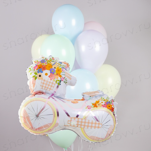 Композиция из воздушных шаров "Прованс" состоит из фонтана шаров, в котором 10 латексных ассорти макарунс и 1 фольгированной фигуры в виде велосипеда с цветами. Размер латексных шаров 35-40см. Гарантированное время полета шариков 48 часов (как правило летают неделю и дольше). Шарики доставляются собранными в сет из фонтана на грузике и фольгированной фигуры на отдельном грузе.