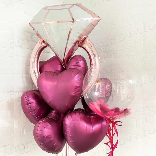 Композиция из шаров "Бриллиантовый сет" состоит из фонтана фольгированных шаров на грузике, в котором 8 сатиновых сердец бургундия и шар в виде бриллиантового кольца; а также шара баблс на отдельном грузике. Гарантированное время полета от 3-х дней. Шарики доставляются собранные в композицию на 2-х грузиках.