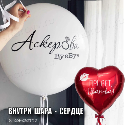 Воздушные шар из латекса "Прощай фамилия", внутрь шара помещен фольгированный шар сердце с новой фамилией невесты и конфетти, оба шарика наполнены гелием. Время полета 8 часов, рекомендуется лопать шар в верхней части, чтобы не повредить внутренний. Цвет шариков и текст надписи на Ваш выбор. Игла в комплект не входит.