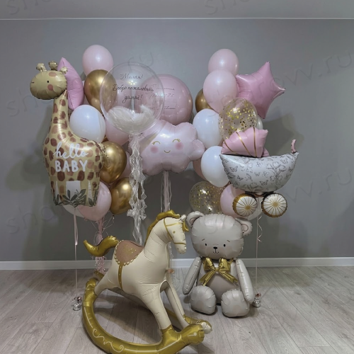 Размер латексных шаров 35-40см. Гарантированное время полета шариков 48 часов (как правило летают неделю и дольше). Шарики доставляются собранные в комплект для эффектного украшения комнаты на выписку малышке.