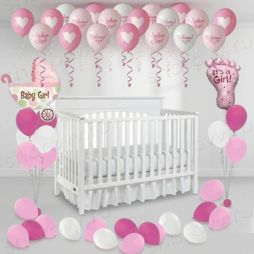 Прекрасное оформление воздушными шарами для девочки на выписку из роддома. В пакет входит: 15 шаров - премиум (с рисунком) под потолок, 15 стандартных шаров на пол и два фонтана. Время полета шариков от 48 часов (как правило летают неделю и дольше)
