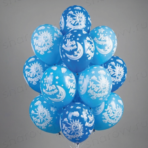 Облако из латексных шаров на выписку "Ура, наш мальчик!" состоит из 13 латексных шариков с готовым рисунком на выписку. Размер латексных шаров 35-40см. Гарантированное время полета шариков 48 часов (как правило летают неделю и дольше). Шарики доставляются собранные в облако которое можно распустить.